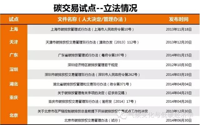 2011年10月国家发展改革委印发《关于开展碳排放权交易试点工作的通知》,批准北京、上海、天津、重庆、湖北、广东和深圳等七省市开展碳交易试点工作。(两省五市)