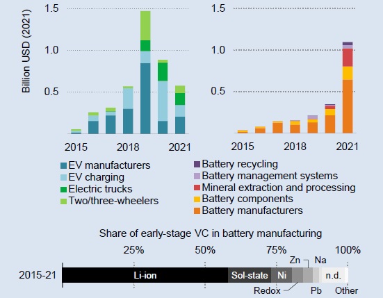 图说:按类型划分(上图)以及按化学类型划分(下图)的电动汽车和电池的早期风险投资