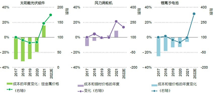图说:2017-2022年太阳能光伏组件、风力涡轮机和锂离子电池的成本和关键材料价格趋势