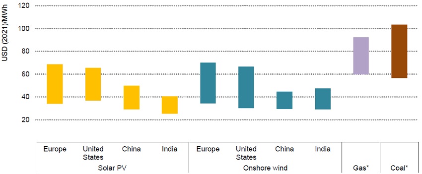尽管原材料和供应链瓶颈等压力带来了可再生能源的成本上升,与2020年的水平相比,2022年可再生能源的平准化电力成本将增加20%至30%,但由于天然气和煤炭价格受地缘政治因素的影响屡创历史新高,相较于化石燃料发电可再生能源发电仍然更具吸引力。