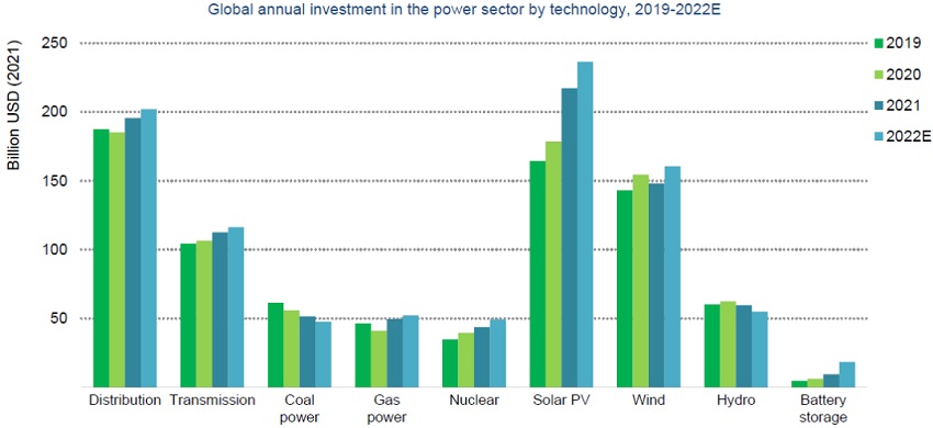 图说:2019-2022年全球电力行业年度投资(按技术划分)