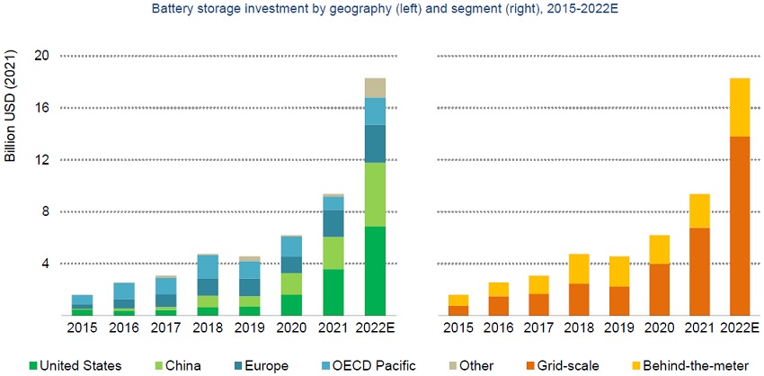 图说:按地理位置(左)和细分市场(右)划分的电池储能投资,2015-2022E