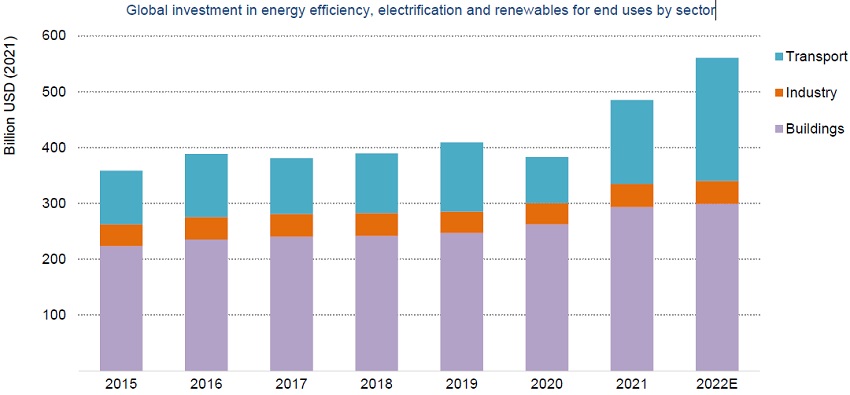 2021年,全球电动汽车销量跃升至650万辆以上,占全球乘用车销量的8%。尽管存在供应链中断和芯片短缺,电动汽车销量将在2022年突破1000万辆大关,由此将带来能源效率和电气化支出激增。虽然政府对电动汽车购买的补贴随着时间的推移而减少,但销售增长仍然强劲,这表明市场正在成熟,随着价格差异的缩小,电动汽车与传统汽车相比更具竞争力。而电动汽车销量的增长正在推动电气化投资,2021年,电气化投资占交通运输部门整体终端投资的45%以上。预计2022年,这一份额将增加到55%以上。
